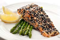 Preparação Num almofariz esmague as bolinhas de pimenta e o sal e junte-lhes as sementes de sésamo. Pincele os lombos de salmão com azeite. Coloque a mistura anterior num prato, e passe um dos lados do salmão por esta mistura pressionando para que adira bem.